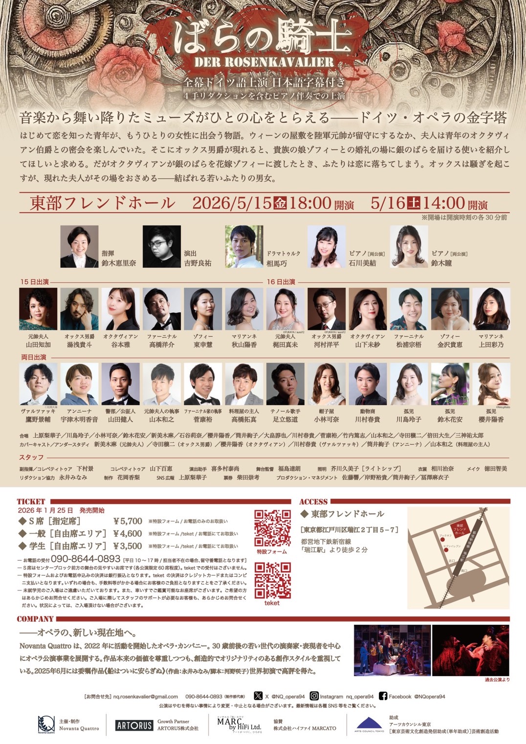 Novanta Quattro #08 リヒャルト・シュトラウス《ばらの騎士》 全幕ドイツ語上演 日本語字幕付き 4手リダクションを含むピアノ伴奏での上演 2026年5月15日(金)18:00開演/1...
